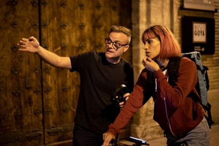 Estaregui, junto a la actriz Mariela Martínez, en el rodaje de Rider (2025) en las calles de Zaragoza.
