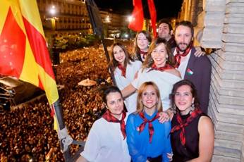 Los directores Javier Macipe, Paula Ortiz y Pilar Palomero, acompañados del actor Pepe Lorente, la realizadora Blanca Torres, la diseñadora de vestuario Arantxa Ezquerro y la alcaldesa Natalia Chueca durante el pregón de las últimas Fiestas del pilar. Javier Belver, EFE.