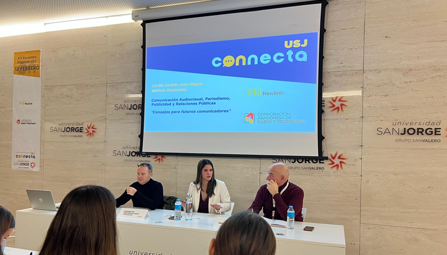 La conferencia, titulada “Consejos para futuros comunicadores”, ha contado con la participación de Javier Romero Collazos de la Corporación Aragonesa de Radio y Televisión (CARTV), y Miguel Justribó, de la consultora Newlink. La sesión estuvo moderada por Belén Sancho, docente del grado en Periodismo.